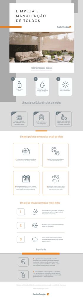 A Hunter Douglas, líder mundial no segmento de cortinas, persianas e toldos, sempre teve muito cuidado na escolha dos tecidos e materiais que compõem suas diferentes linhas de produtos. E, para manter a funcionalidade e beleza dos toldos, é preciso zelar pela boa higienização.