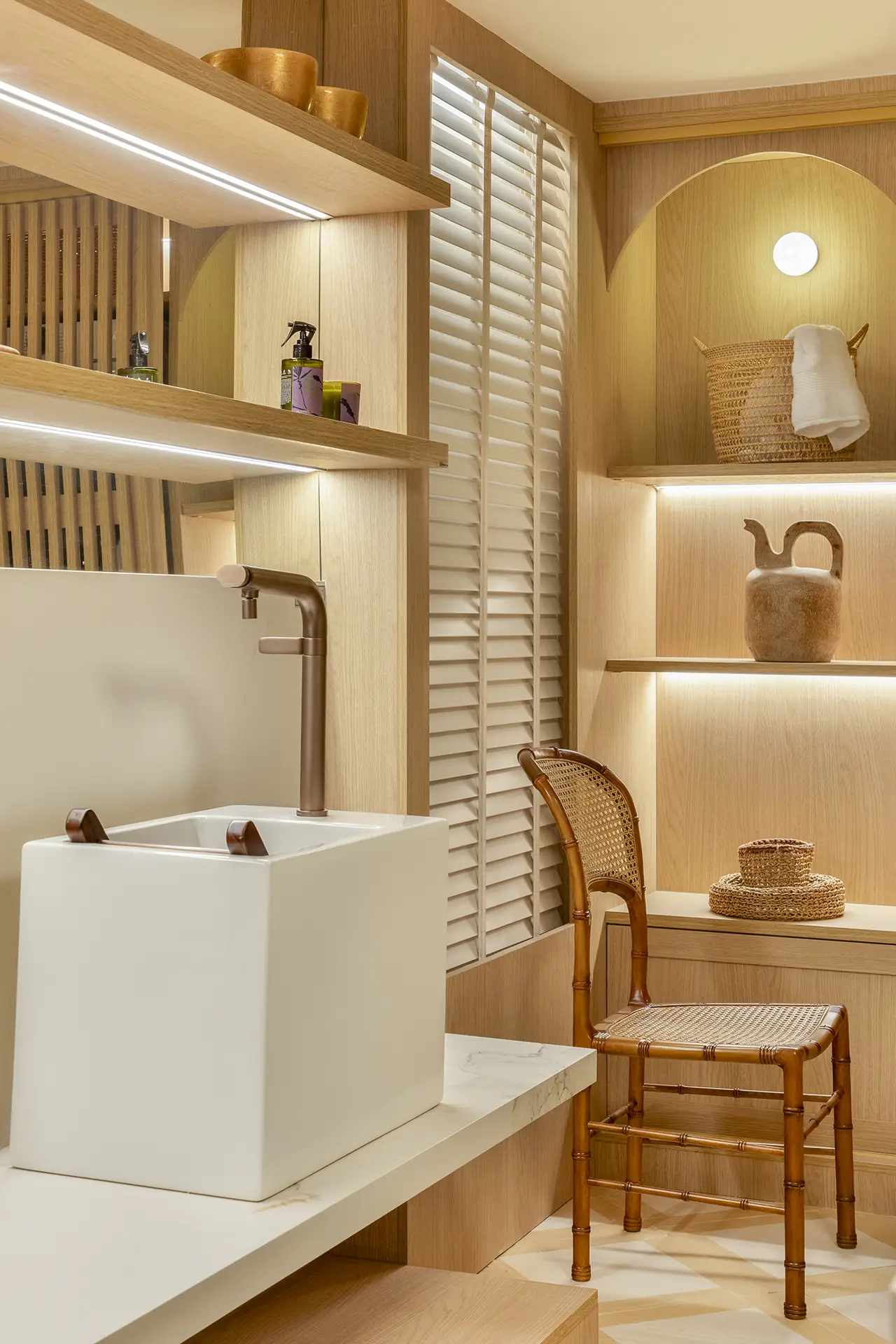 Elementos artesanais, peças retrô, tons terrosos e formas orgânicas trazem um toque de aconchego, enquanto a estética contemporânea reinterpreta o passado. O resultado é um espaço que equilibra memória afetiva e modernidade, criando uma experiência única e convidativa.